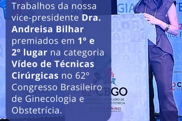 Durante o 62º CBGO, realizado entre os dias 14 e 17 de maio de 2025, no Riocentro – RJ, dois trabalhos de autoria da Dra. Andreisa Bilhar se destacaram na categoria Vídeo de Técnicas Cirúrgicas.