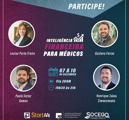 PARTICIPE! Nesta segunda-feira (07/12), às 19h30, começa o Curso Inteligência Financeira para Médicos, através da plataforma Zoom. Um evento realizado pela Socego em parceria com a Start Investimentos, que traz nos dias 7 a 10 de dezembro uma imersão de conhecimento na área financeira, com tópicos específicos para profissionais da medicina.