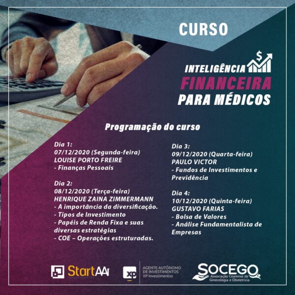 Em parceria com a StartAAi investimentos, a Socego realizará nos dias 7 a 10 de dezembro o curso: Inteligência Financeira para Médicos. Serão quatro dias de imersão, no horário de 19h30 às 21h, através da plataforma Zoom.